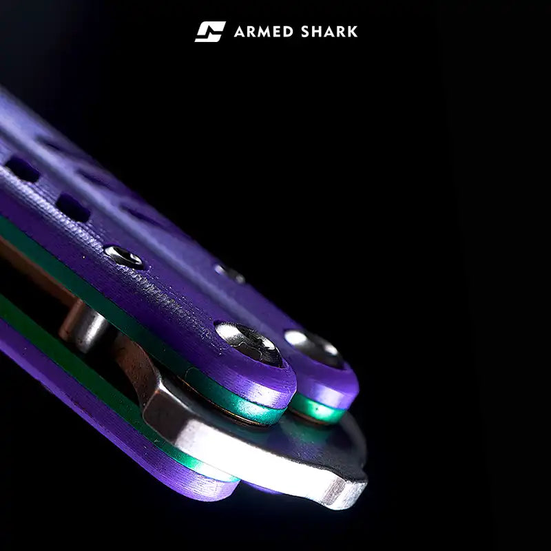 Advance your flipping with the Armed Shark REP Balisong Butterfly Trainer. A 5Cr15 stainless-steel training edge pairs with precision-machined handles (G10 or carbon-fiber patch over alloy core) to deliver crisp balance and durable performance. Chamfered comfort edges, hard-anodized finishing, and a double-effect bushing pivot keep action smooth for confident daily practice.